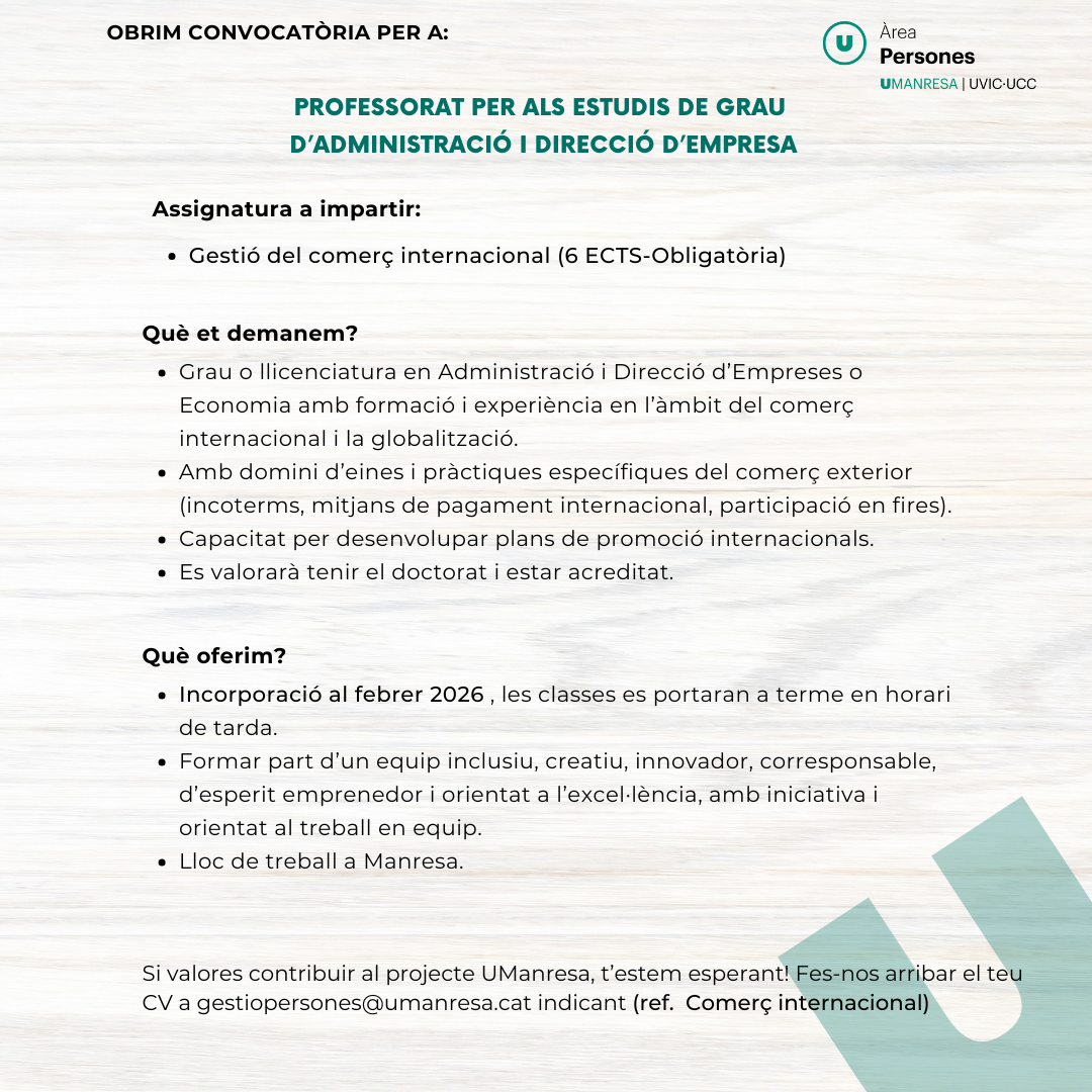 Para inscribirte, envíanos tu CV a gestiopersones@umanresa.cat indicando la referencia Comercio internacional.